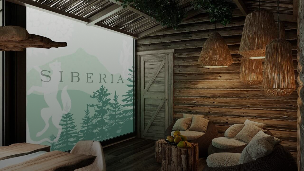 В интерьере старались передать атмосферу колоритного уютного домика в таежной глуши с горячей банькой и душистыми вениками. Стены — имитация грубо обработанного состаренного сруба с джутовым канатом на стыках , потолок выполнен в форме скатной крыши из материалов добытых в тайге (wink) и на самом коньке крыши — сушатся веники (декор). На контрасте с грубыми фактурными деревянными поверхностями отделки, некоторые стены отделаны глянцевым стеклом подсвеченным изнутри. Отдельным арт-объектом в этом помещении является стол из слэба с имитацией текущей вдоль него реки (эпоксидная смола) стоящий на необработанных стволах деревьев которые пронизывают столешницу и имитируют торчащий из воды коряжник. Мягкая зона выполнена в сдержанном стиле дабы диваны по дизайну не спорили с колоритом помещения, изюминкой этой зоны являются большие плетеные подвесные светильники похожи на ульи лесных пчел свисающие с дерева.